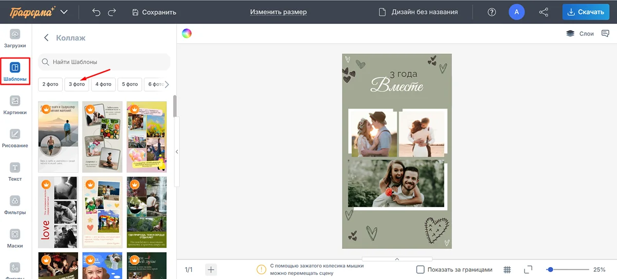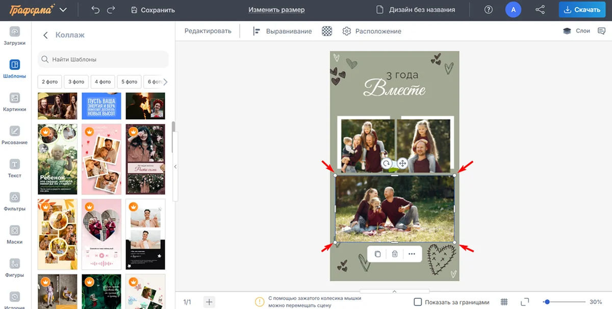 - Если хотите справиться с задачей максимально быстро, обратите внимание на Граформу. Здесь доступно множество шаблонов под разное количество фото.
