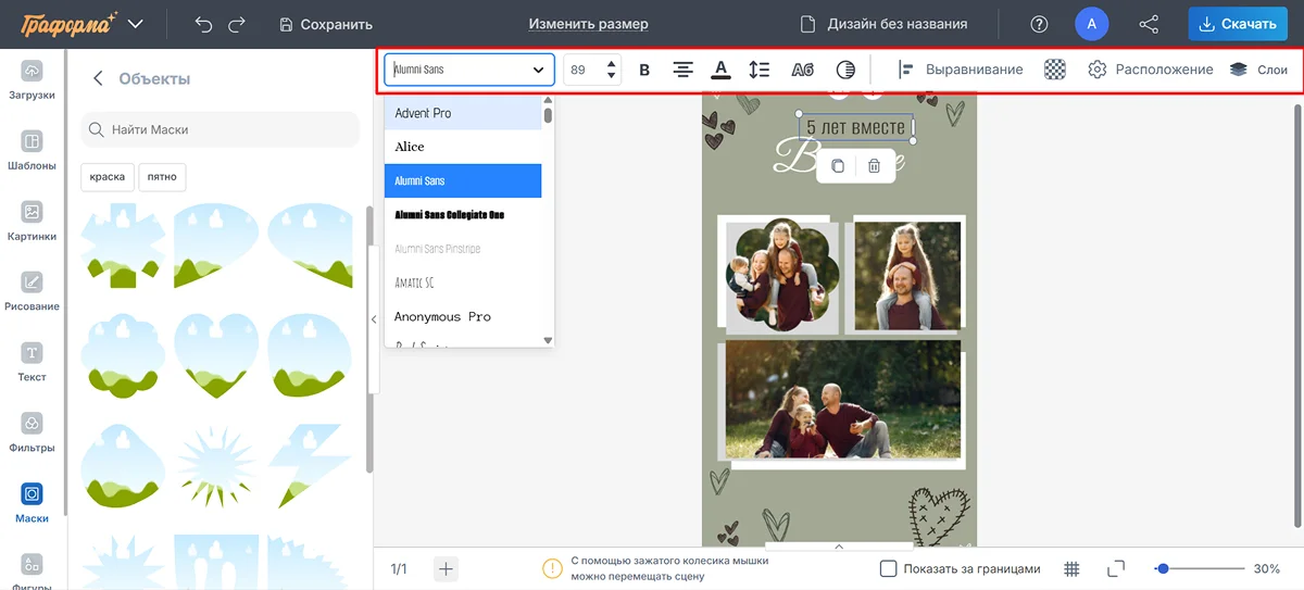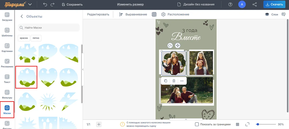 5. В Граформе есть маски. Это своеобразные рамки, которые преобразуют края изображения в соответствии со своей формой. Чтобы воспользоваться функцией, откройте раздел с масками. Выберите нужную и перетащите на холст. Затем щелкните по кнопке с тремя точками, выберите пункт «Заменить изображение». Укажите путь к фото, которое хотите встроить в маску.