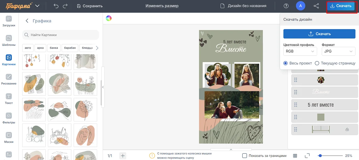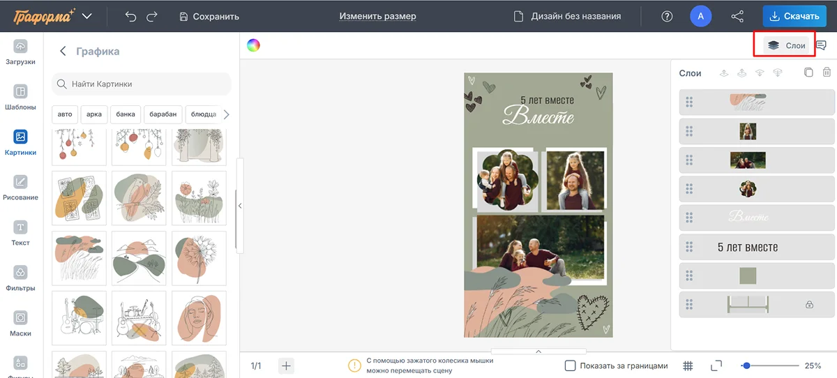 7. Дополните композицию клипартом. Найдите подходящую графику в разделе «Картинки» или загрузите собственный файл PNG с прозрачным фоном.