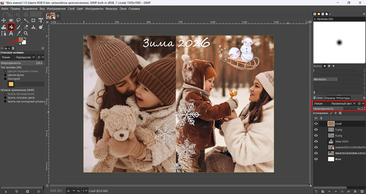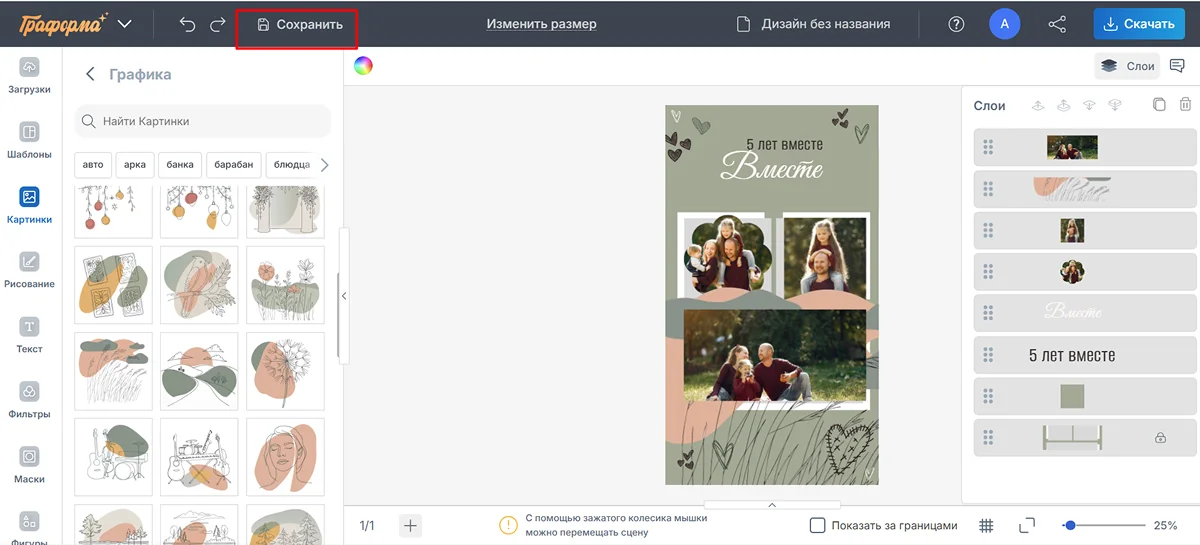 9. Чтобы сохранить проект для последующего редактирования, нажмите слева сверху на значок дискеты. Композиция будет сохранена со всеми слоями в вашем личном кабинете.