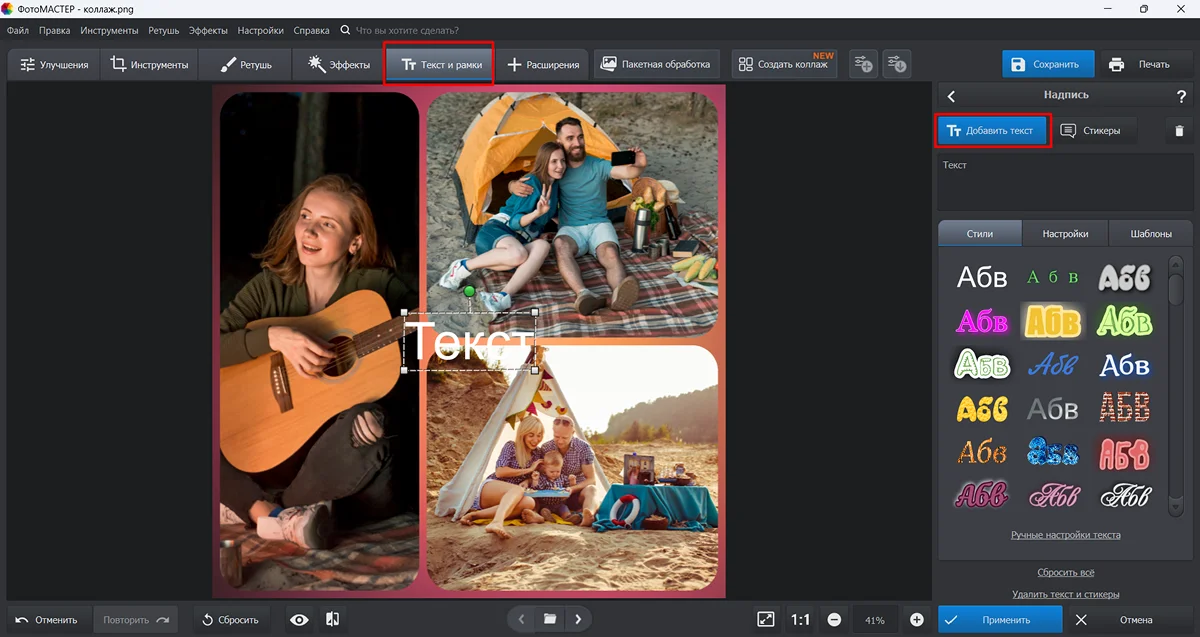 7. Обычно процесс создания коллажа из фотографий не обходится без добавления надписей. Откройте раздел «Текст и рамки» и кликните по кнопке «Добавить текст».