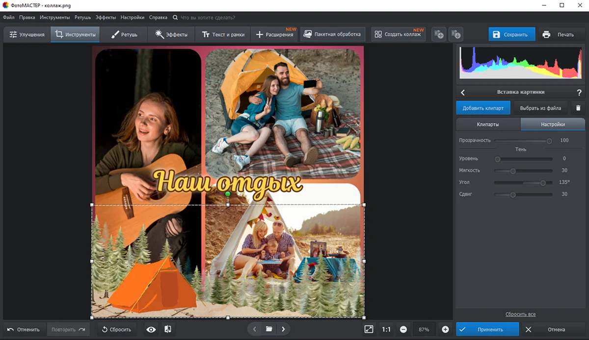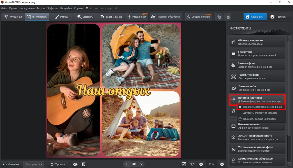 8. Дополните композицию клипартом. Перейдите в раздел «Инструменты» и найдите в списке опцию «Вставка картинки».