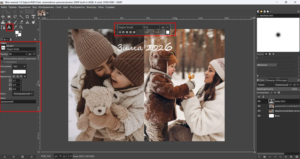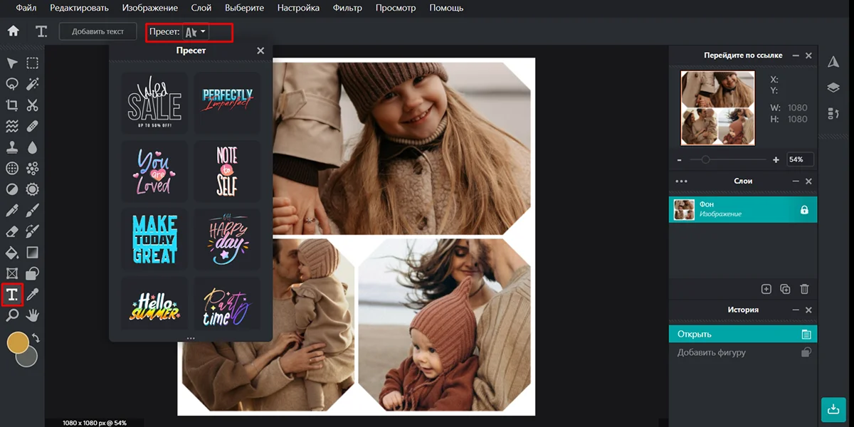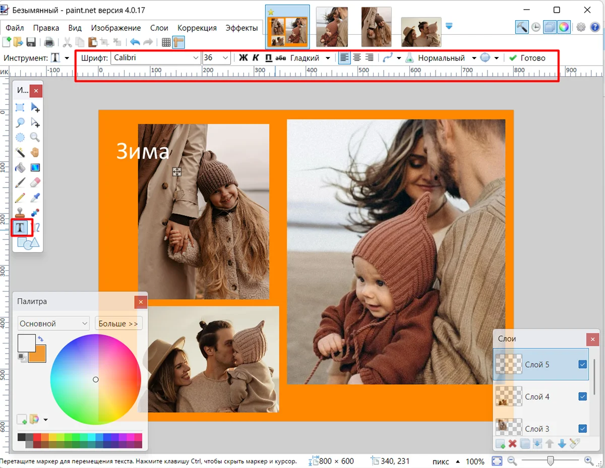 4. На левой панели найдите инструмент «Текст» и активируйте вертикальный режим. Напишите желаемые слова в пробеле между стыком фотографий.