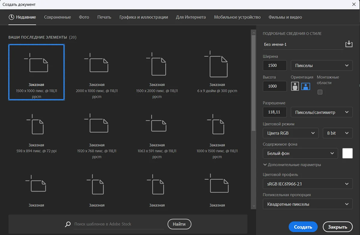 1. Запустите и используйте команду Ctrl+N, чтобы создать страницу с нужными параметрами.
