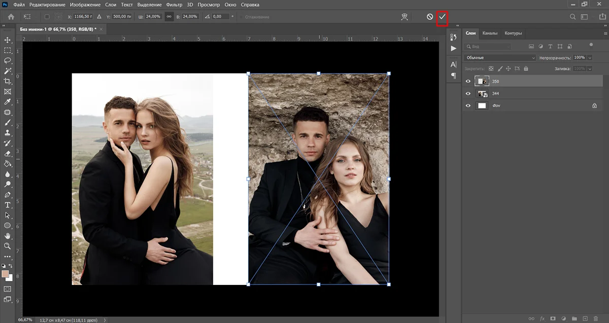 Если нужно, отрегулируйте размер слоев при помощи рамки.
