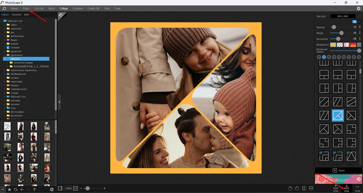 6. Если хотите наложить текст, вам придется сохранить созданный коллаж через Save в правом нижнем углу экрана, а затем заново его открыть в программе в модуле Editor.