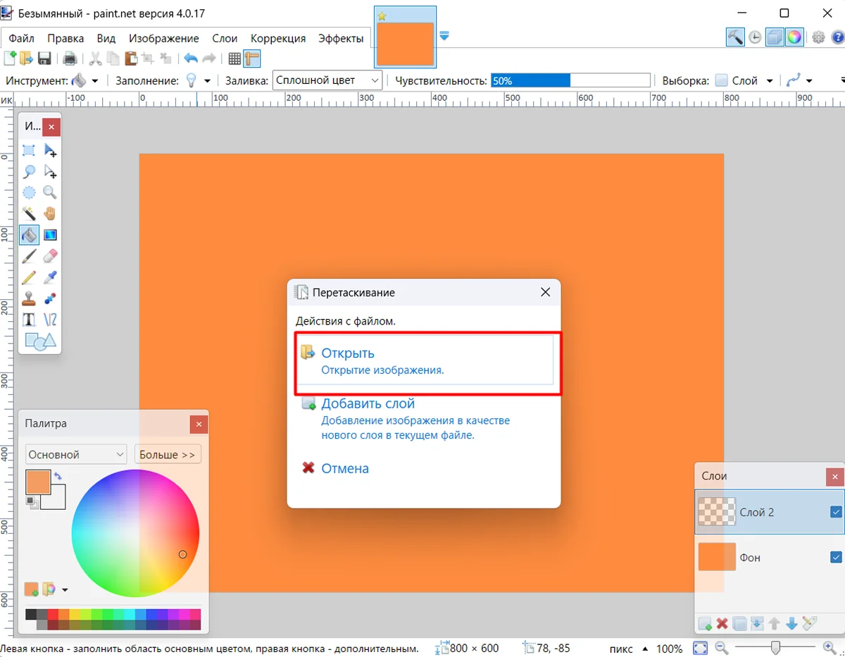 4. Перетащите первый снимок в рабочую область. Появится окно, в котором нужно указать способ размещения картинки. Выберите «Открыть».