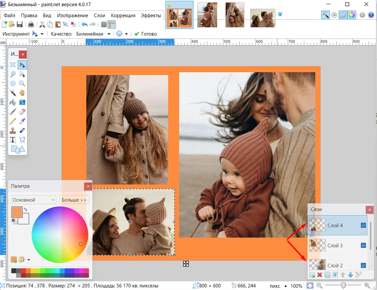 6. Масштабируйте размеры снимка. Чтобы не деформировались пропорции при уменьшении (или увеличении), зажмите Shift и двигайте границу рамки. Таким же манером разместите остальные фотографии. Перемещайте слои, чтобы менять порядок фото на листе.