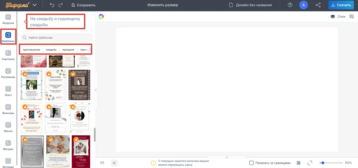 Во вкладке «Шаблоны» отыщите макет на свадебную тематику и кликните по нему.
