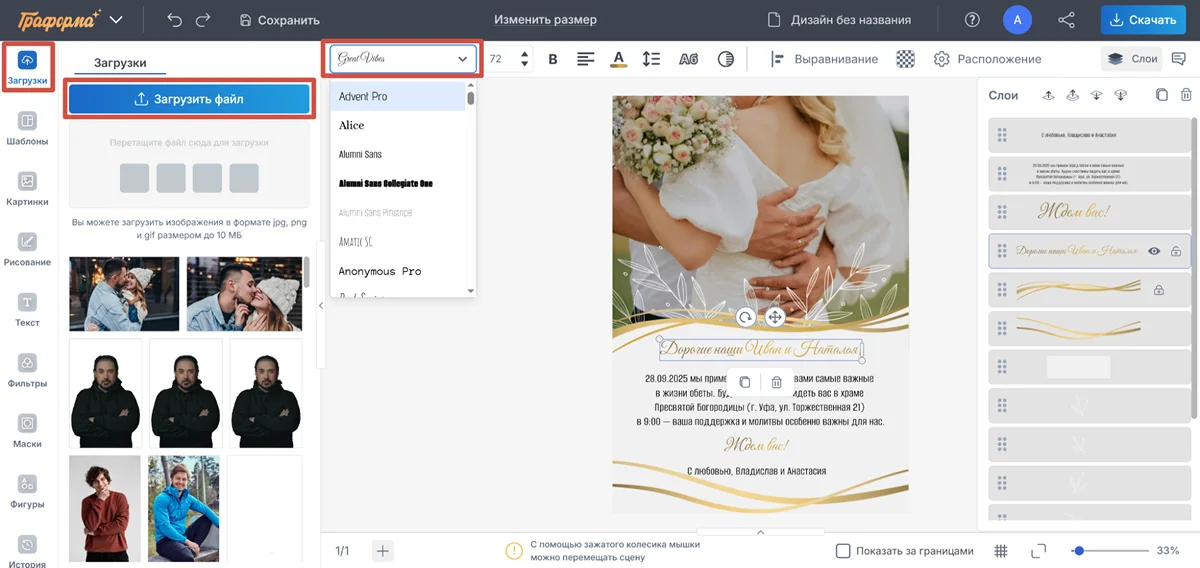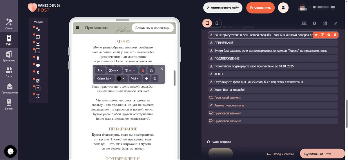 Продолжаем разбираться, как самостоятельно сделать электронное пригласительное на свадьбу на уровне профи. Отредактируйте блок с описанием: укажите имена гостей, дату события и адрес проведения мероприятия. Скорректируйте по своему усмотрению размер и шрифт, настройте выравнивание и прозрачность.