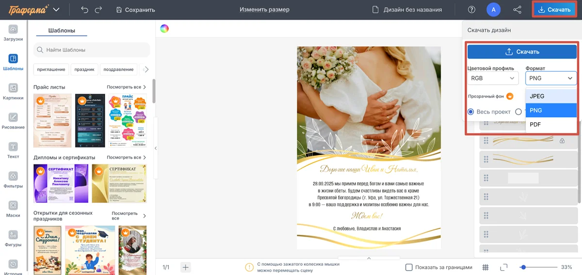 Когда все будет готово, нажмите на кнопку «Скачать». Выберите подходящий цветовой профиль: RGB подойдет для отправки электронных пригласительных по email или через соцсети, а CMYK для печати. Укажите, в каком формате нужно экспортировать результат: PNG, JPEG, PDF. Снова нажмите «Скачать».