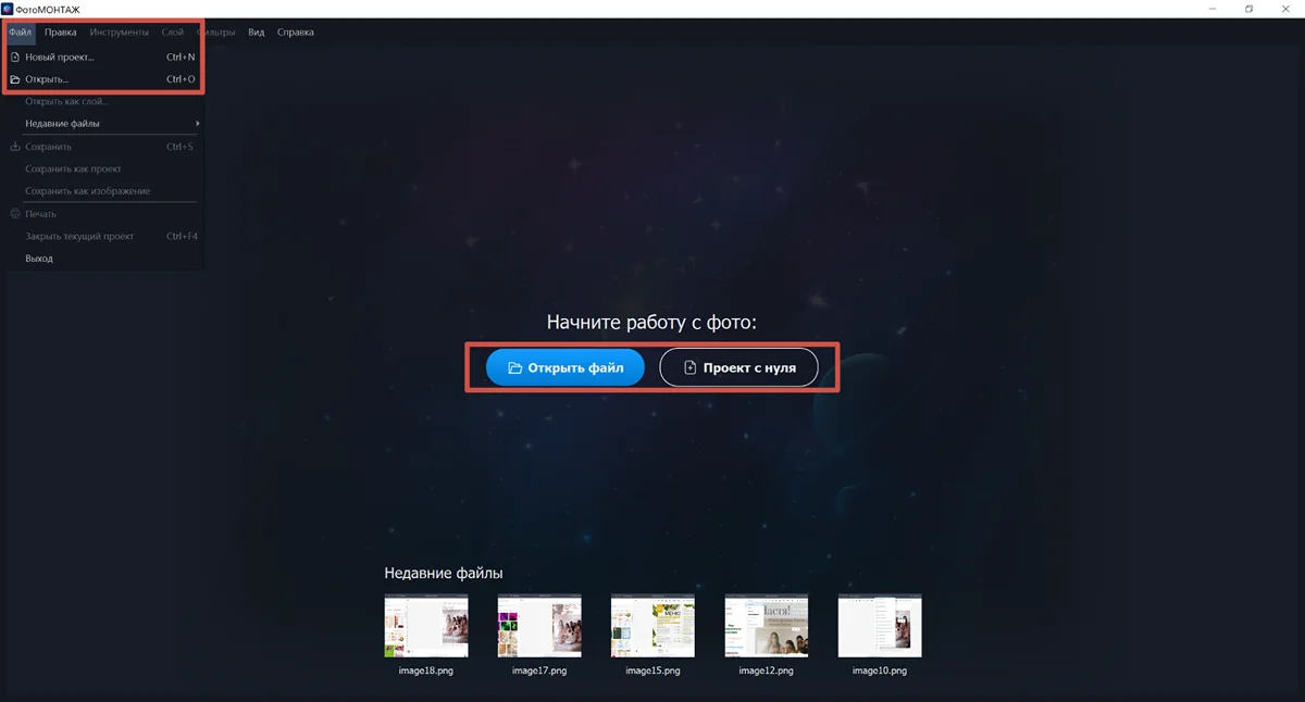 Загрузите программу с официального сайта и сразу откройте заготовку (фон или фотографию пары) либо создайте проект с нуля.