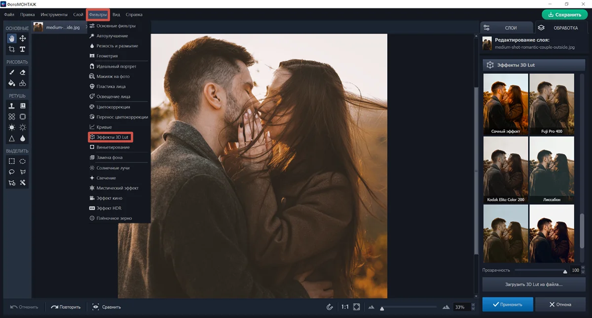 Чтобы исправить экспозицию или устранить блики, перейдите в «Фильтры» → «Основные фильтры» → «Ручные настройки» и отрегулируйте параметры при помощи бегунка на шкале. Для стилизации картинки нажмите на «Эффекты 3D LUT» и примените подходящий пресет.