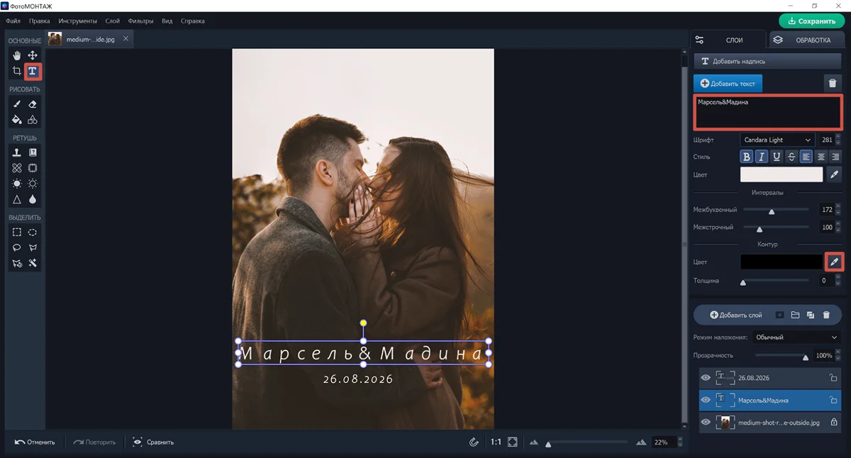 На панели справа нажмите на кнопку «Добавить надпись». В поле для ввода текста укажите имена гостей и брачующихся, а также дату предстоящего события. Чтобы подобрать цвет символов в тон фону, воспользуйтесь пипеткой. Скорректируйте межбуквенное и межстрочное расстояние для текста. Отрегулируйте толщину, прозрачность и выравнивание символов.