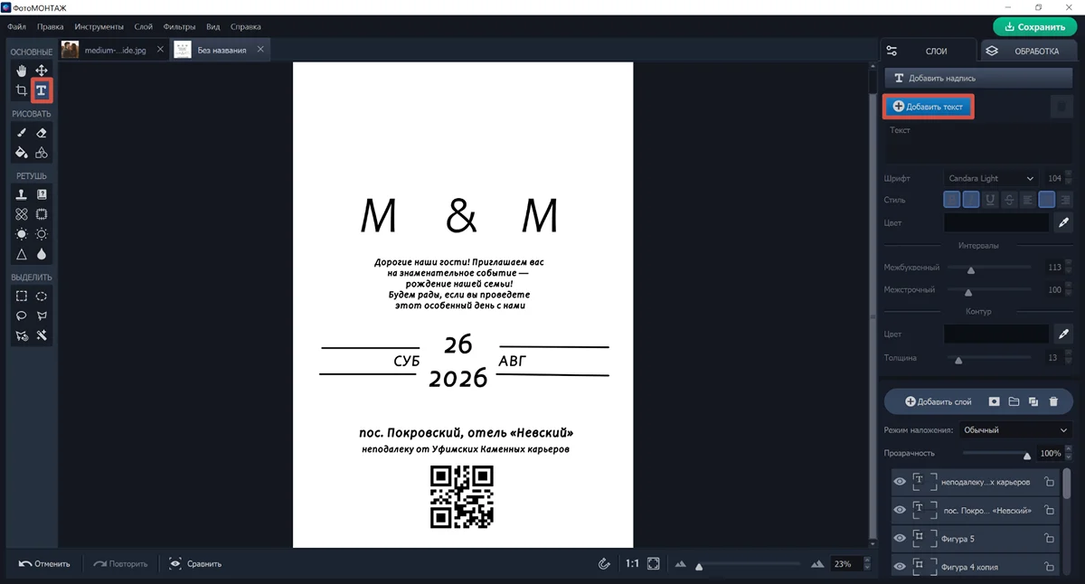 На ней можно разместить дополнительную информацию. Чтобы создать оборот для свадебного пригласительного, кликните «Файл» → «Новый проект». Размеры и ориентацию поставьте такие же, как у лицевой стороны. Добавьте необходимую информацию: дату и место проведения, короткое обращение, логотип из инициалов брачующихся. При желании можете вставить QR-код для перехода на подробное описание свадьбы онлайн.