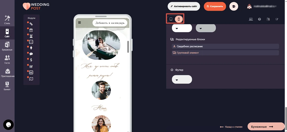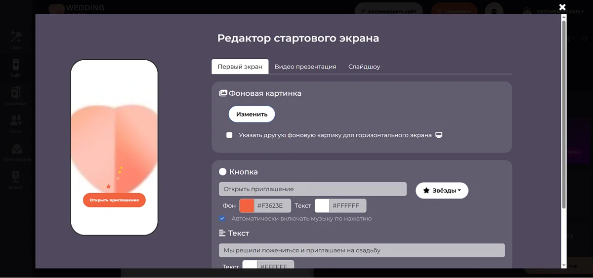 Выберите тариф исходя из того, какие модули должен содержать сайт. После оплаты в личном кабинете появится ссылка на онлайн-пригласительное без ватермарки.