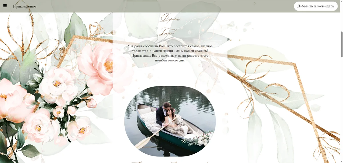 Содержимое страниц пригласительного онлайн соотвествует информации из брифа. Далее вы можете заменить шаблонные фото на портреты жениха и невесты, добавить дополнительные материалы. На следующих слайдах гостям можно предложить пройти опрос на тему предпочтений или ограничений, связанных с блюдами в меню. Отдельно стоит добавить блок с информацией по дресс-коду и пожеланиям по подаркам, а также кнопку с подтверждением присутствия гостя на событии.