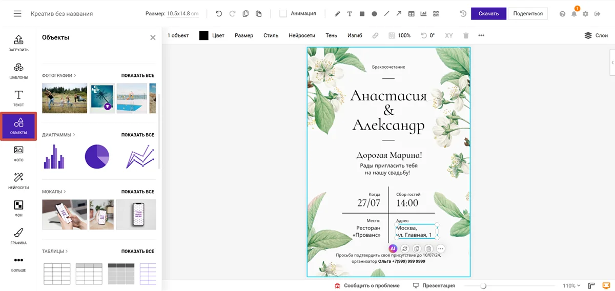 Встроенная нейросеть способна распознать предметы на переднем плане и убрать фон с лишними объектами. Через ИИ можно быстро улучшить качество картинки, а также составить описание для конкретного блока. Для лаконичных электронных свадебных приглашений в стиле минимализм доступна команда SUPA Magic: она создает до 10 уникальных вариантов нового дизайна на базе исходного образца.