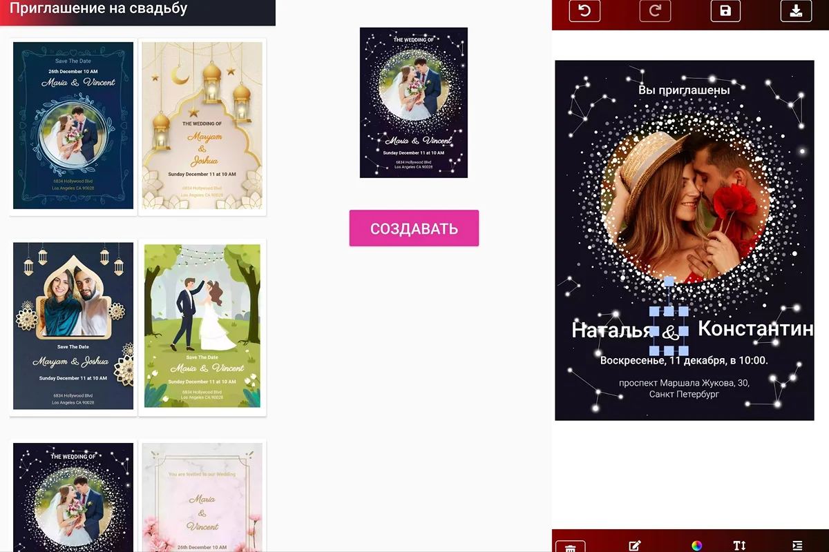 Нажмите «Создать». Напишите имена будущих молодоженов, загрузите с телефона совместный портрет, кадрируйте его для добавления в шаблон.