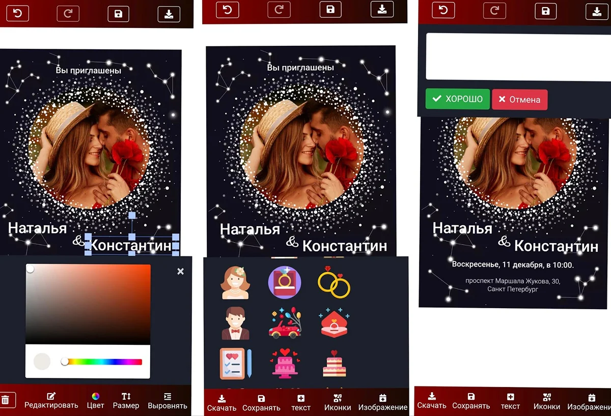 Как сделать электронное приглашение на свадьбу на Android? Загрузите из магазина приложений специальный мобильный конструктор. Он предлагает более 200 дизайн-макетов и большое количество тематических иконок. Готовое пригласительное можно отправить прямо из приложения по электронной почте или через мессенджеры.