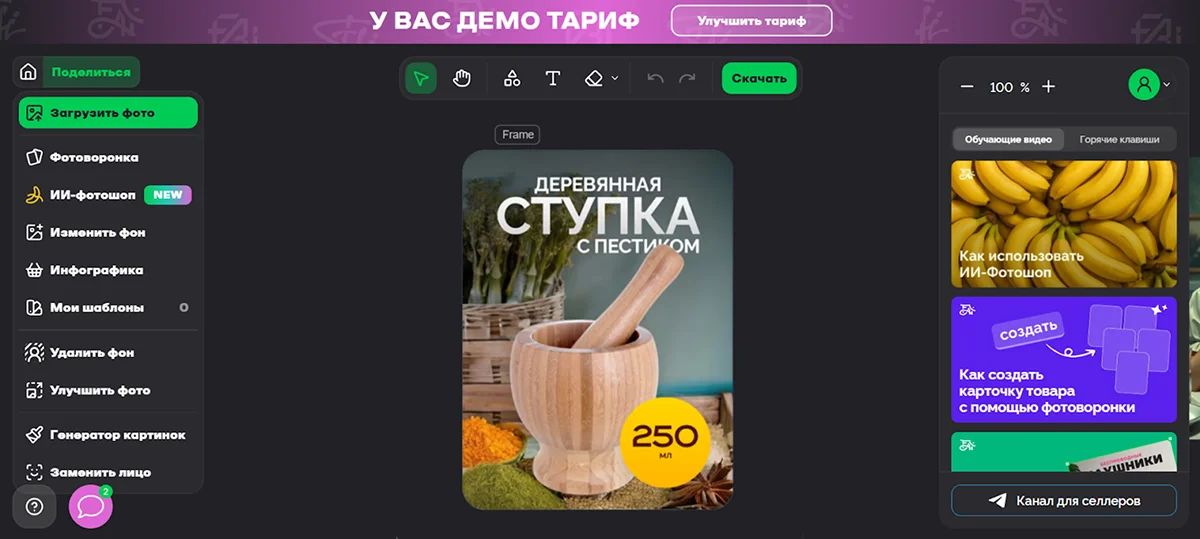 Это специализированный сервис для подготовки визуального контента под разные маркетплейсы. Здесь легко можно создать карточку товара на Ozon, Wildberries, Яндекс Маркет, Kaspi, Avito и Lamoda.