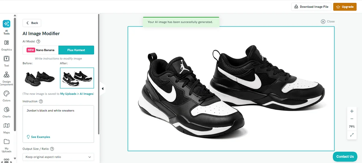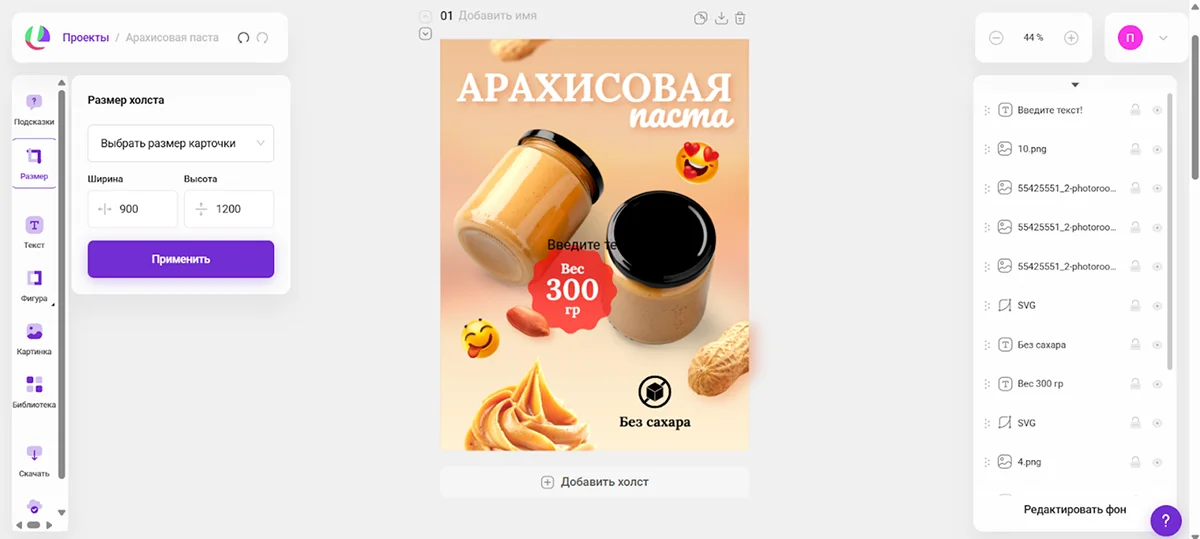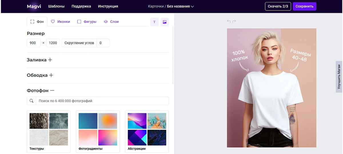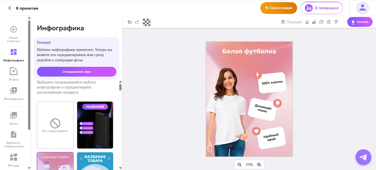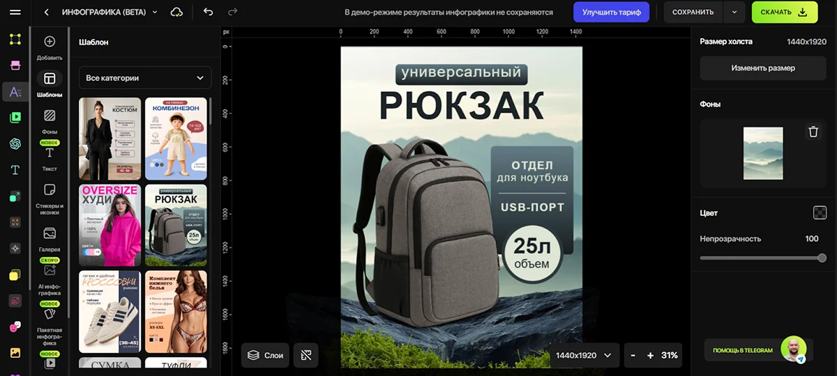 Удалите задний план с загруженной картинки, выберите вариант оформления информации, сгенерируйте фон в стиле «минимализм» или «реализм». После доработайте шаблон вручную. Например, переместите объекты, трансформируйте текст, добавьте фигуры и клипарт, адаптируйте размер холста под нужную площадку.