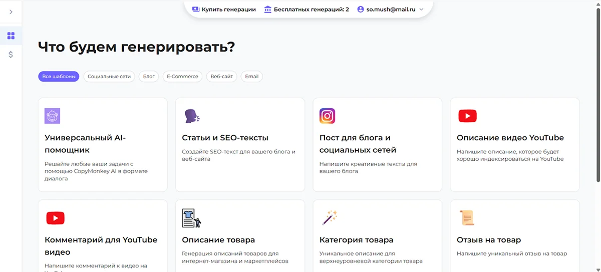 Если вы ищете ИИ для создания инфографики для маркетплейсов бесплатно, присмотритесь к этому сервису. Здесь можно генерить уникальные описания к разным категориям товара и даже отзывы. В неделю можно использовать 3 бесплатные попытки.