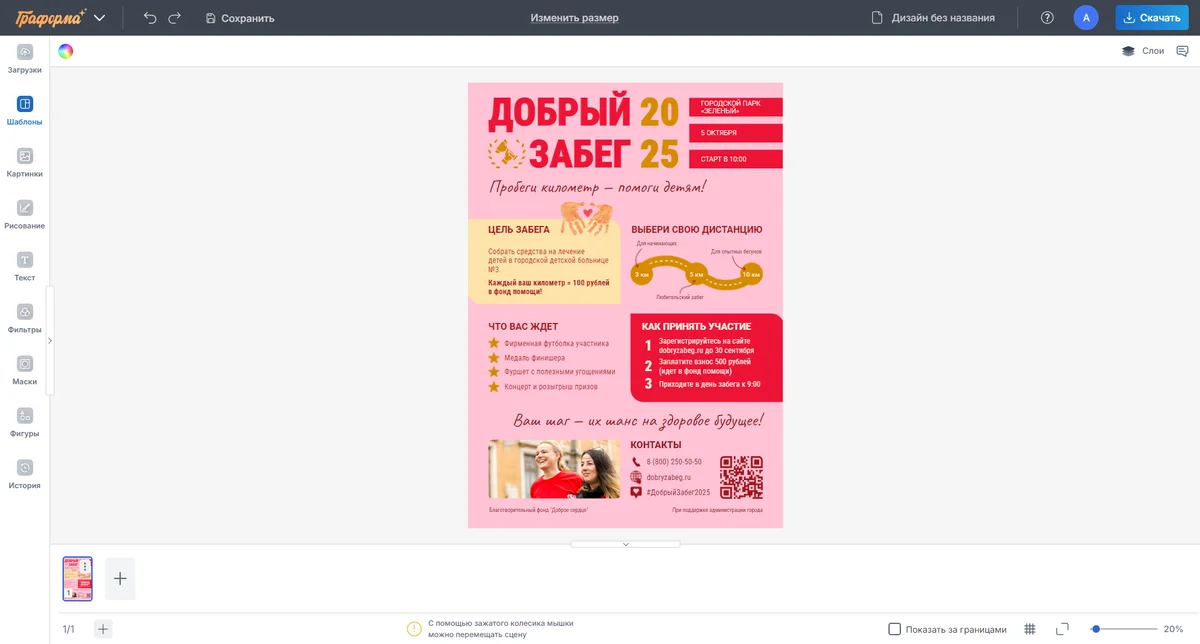 Создавайте уникальные дизайны с помощью инструментов Граформы! Используйте фильтры, маски и функцию рисования, чтобы листовки стали запоминающимися. Все инструменты интуитивно понятны и помогут вам легко и быстро воплотить любую задумку.