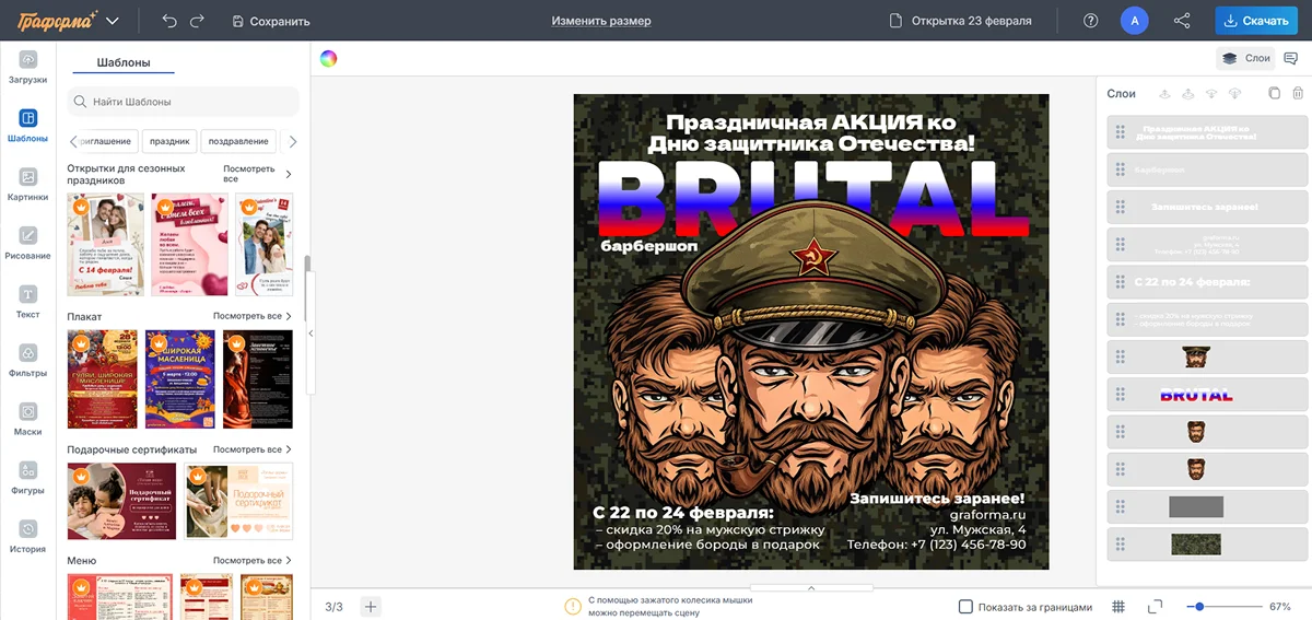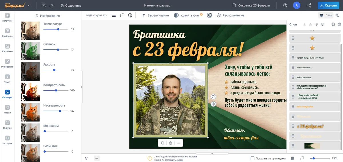 Забудьте о долгих поисках подходящей открытки и сложных программах. Оформите свой уникальный подарок для защитника Отечества всего за пару минут в онлайн-сервисе Граформа. Простые и удобные инструменты помогут воплотить в жизнь любую идею. Наслаждайтесь творчеством и радуйте необычными подарками близких и коллег!