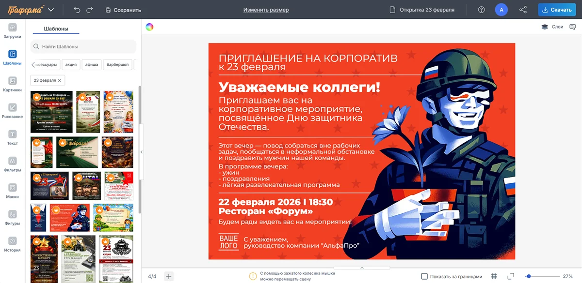 В разделе «Шаблоны» откройте категорию «Открытки». Для быстрого поиска воспользуйтесь фильтром «23 февраля» или «День защитника Отечества». Кликните на подходящий макет, чтобы начать редактирование.