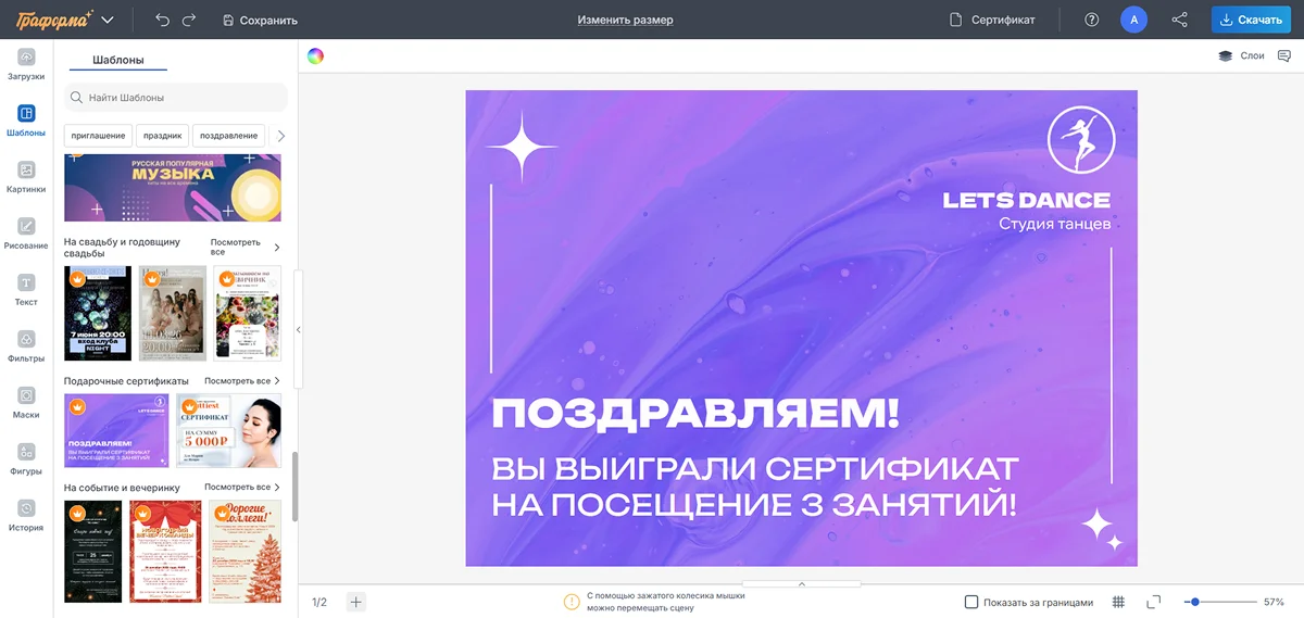 В Граформе вы можете создать подарочный сертификат онлайн и бесплатно всего за пару кликов. Выберите макет, добавьте текст — и уникальный подарок готов!